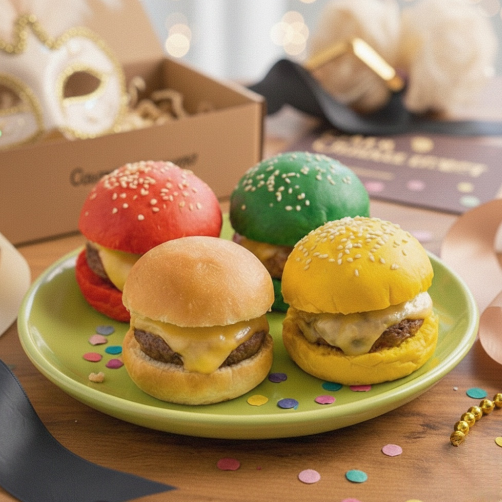Leve o espírito do Carnaval para a sua mesa com nossos Mini Sanduíches Coloridos! Cada unidade combina o clássico sabor de um cheeseburger gourmet artesanal com o visual vibrante dos brioches nas cores verde, vermelho e amarelo. Perfeitos para festas, bloquinhos, aniversários, eventos corporativos, coffee breaks e mesas de petiscos, esses minis são lindos, práticos e deliciosos — a cara da folia!